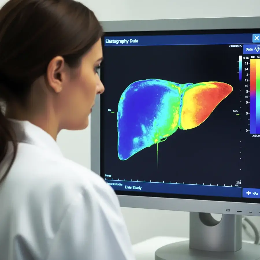 Médica analisando no monitor a elastografia, com imagem em cores que mostram diferentes níveis de gordura no fígado e possível fibrose